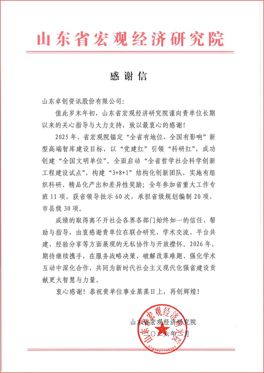 近日,山东省宏观经济研究院向卓创资讯发来感谢信,对我司长期以来在联合研究、学术交流、平台共建、经验分享等方面给予的支持表示感谢。